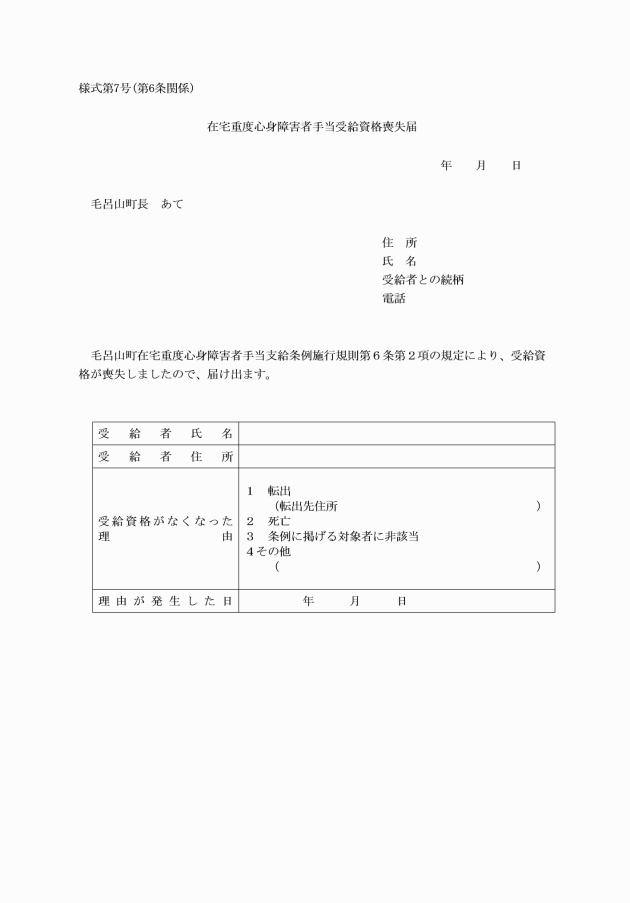 第6条 受給者は、氏名又は住所等に変更があったときは、在宅重度心身障害者手当受給変更届(様式第6号)を町長に提出しなければならない。