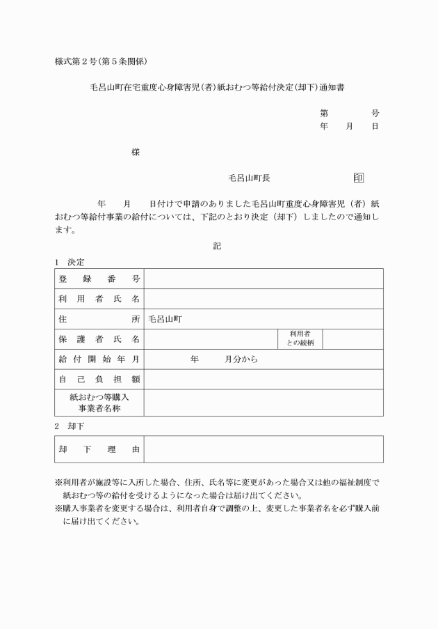 第5条 町長は、申請書の提出があったときは、速やかに調査を行い、給付の可否を決定し、毛呂山町在宅重度心身障害児(者)紙おむつ等給付決定・却下通知書(様式第2号)により申請者に通知するものとする。