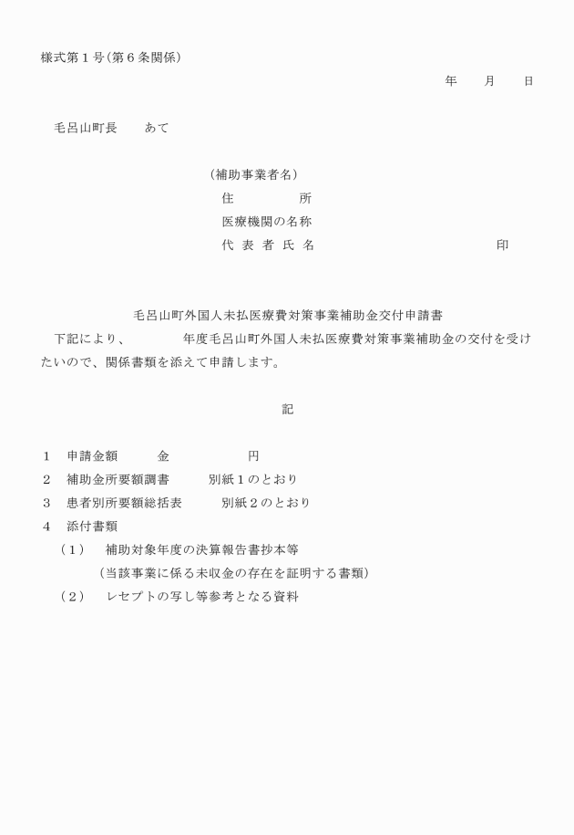 第6条 補助金の交付を受けようとする医療機関は、毛呂山町外国人未払医療費対策事業補助金交付申請書(様式第1号)に、次に掲げる書類を添えて町長に提出しなければならない。