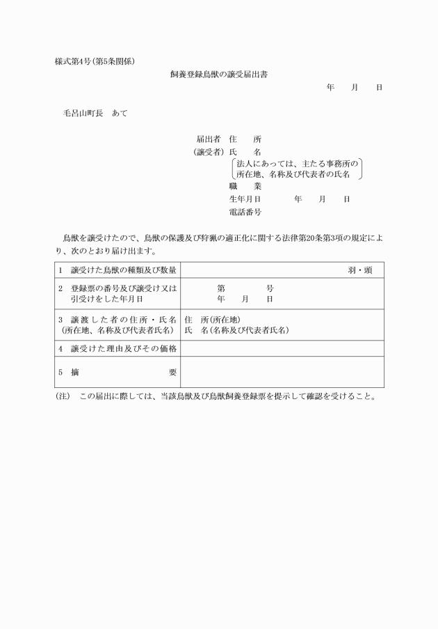 第5条 省令第21条の規定による届出は、飼養登録鳥獣の譲受届出書(様式第4号)により行うものとする。