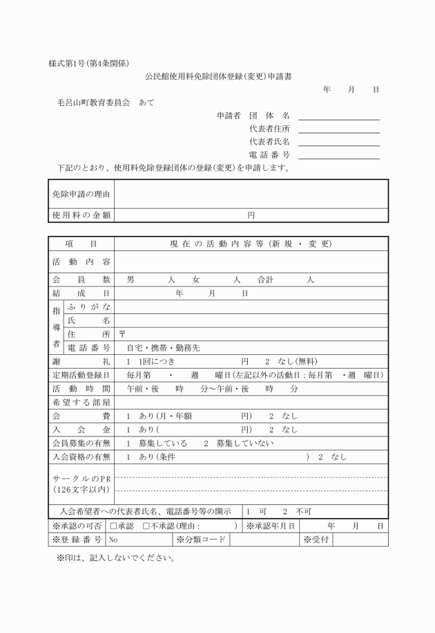 (1) 公民館使用料免除団体登録(変更)申請書(様式第1号)