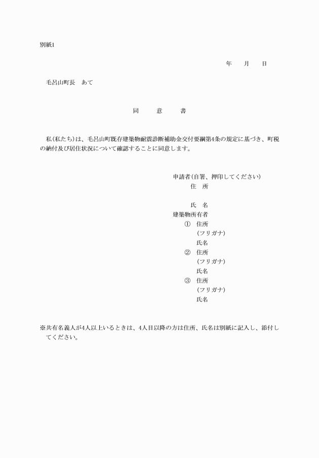 第6条 補助金の交付を受けようとする補助対象者(以下「申請者」という。)は、耐震診断実施前に毛呂山町既存建築物耐震診断補助金交付申請書(様式第1号)に次に掲げる書類(写し可)を添えて、町長に提出しなければならない。