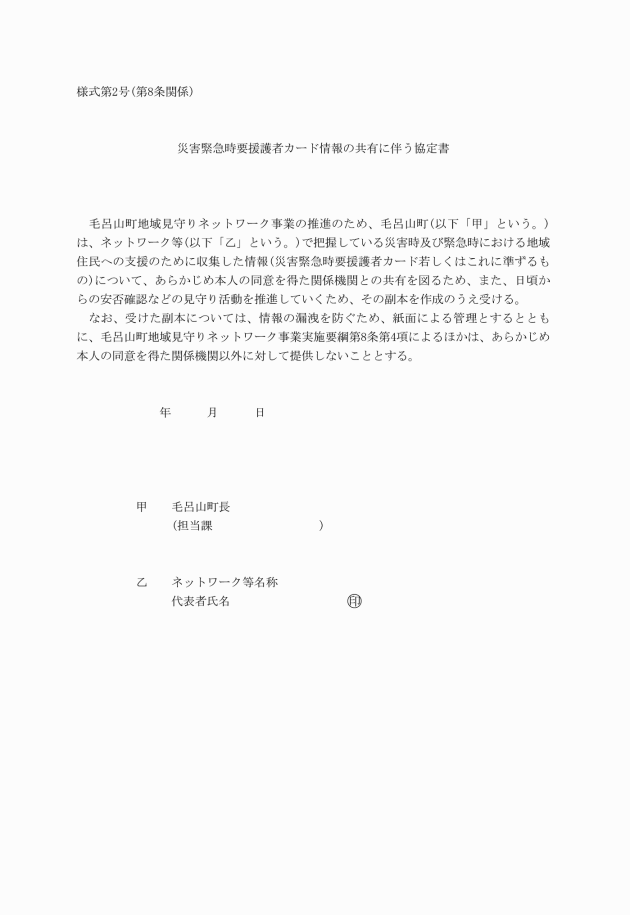 2 町は、各見守りネットワーク又は民生委員ごとに災害緊急時要援護者カード情報の共有に伴う協定書(様式第2号)を締結した後、カードの副本を作成し、本人の同意を得た関係機関との間で共有していくものとする。