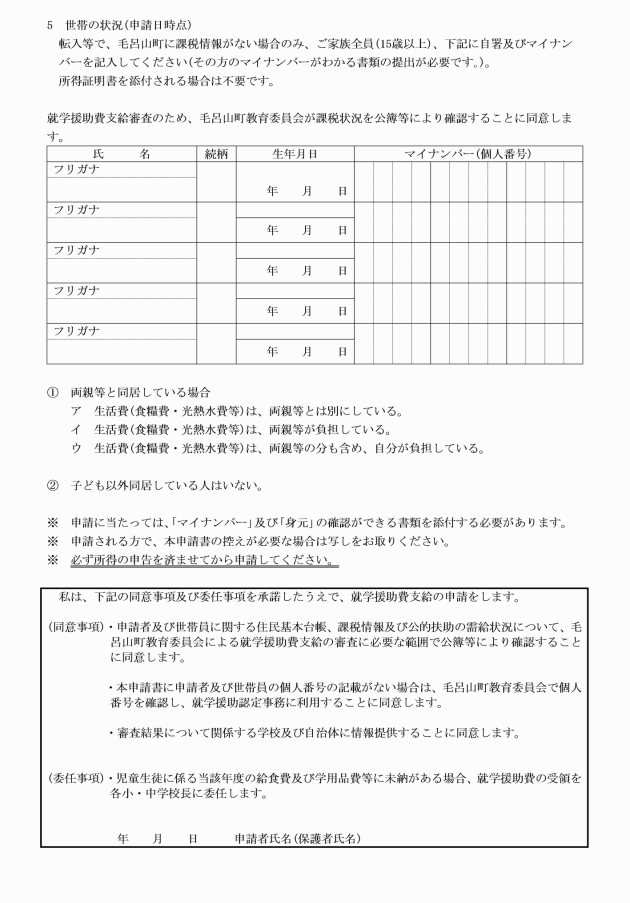 第5条 就学援助を受けようとする保護者(以下「申請者」という。)は、認定期間ごとに毛呂山町就学援助費支給申請書(様式第1号)に次に掲げる書類を添付して、教育委員会に提出しなければならない。ただし、生活保護法第6条第1項に規定する被保護者については、この限りでない。