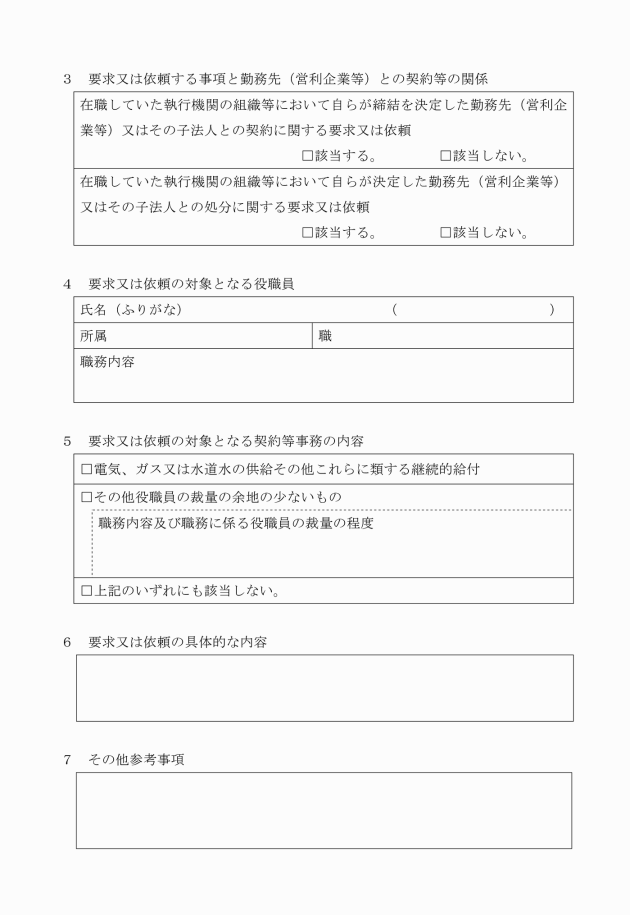 第9条 法第38条の2第6項第6号の規則で定める場合は、同号の要求又は依頼に係る職務上の行為が電気、ガス又は水道水の供給その他これらに類する継続的給付を受ける契約に関する職務その他役職員の裁量の余地が少ない職務に関するものである場合とする。