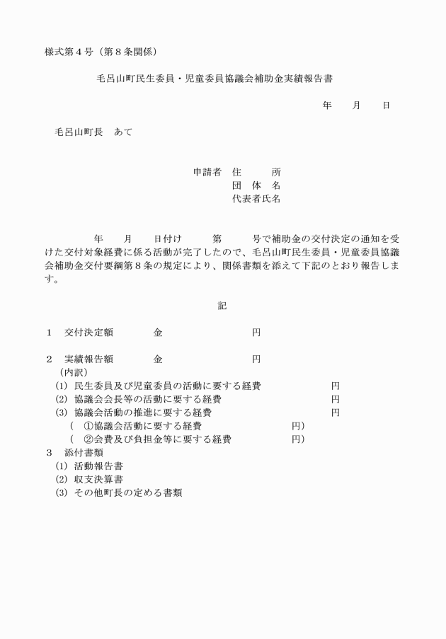 第8条 協議会は、会計年度終了後速やかに、毛呂山町民生委員・児童委員協議会補助金実績報告書(様式第4号)を町長に提出しなければならない。