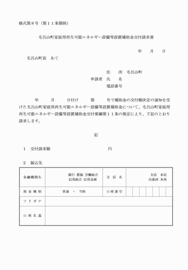 第9条 交付決定者は、再生可能エネルギー設備等の設置工事完了後又は当該設備等が設置された建売住宅の入居後、補助金の交付申請をした日の属する年度の3月15日までに、毛呂山町家庭用再生可能エネルギー設備等設置補助金実績報告書(様式第6号)に次に掲げる書類を添付して、町長に提出しなければならない。