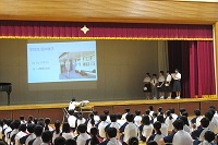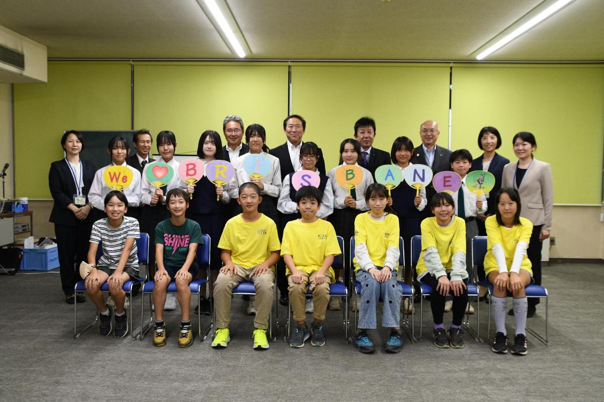 【集合写真(国内交流事業(前列)、中学生海外留学事業(中列)に参加した児童生徒)】