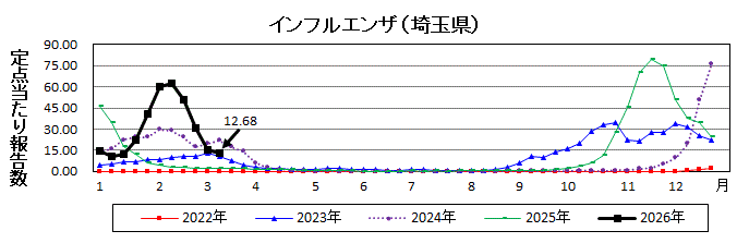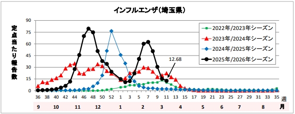埼玉県発表の統計によると、令和8年3月9日~3月15日の定点からの報告では、インフルエンザの患者は2,231人(定点当たり12.68人)と3週連続で大きく減少したが、11週は小幅な減少に留まり、やや多い状況にあります。年齢階級別では、14歳以下の報告が全体の約74%でした。基幹定点におけるインフルエンザの入院患者の報告は4人でした。
