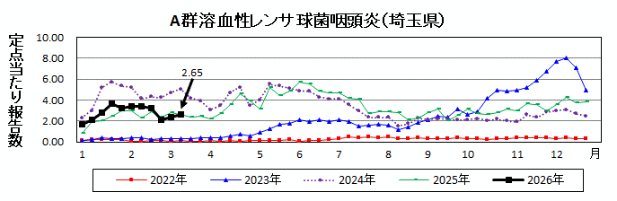 埼玉県発表の統計によると、令和8年3月9日~3月15日の定点からの報告では、A群溶血性レンサ球菌咽頭炎の患者は294人、定点当たり2.65人で、先週と比較して増加しました。