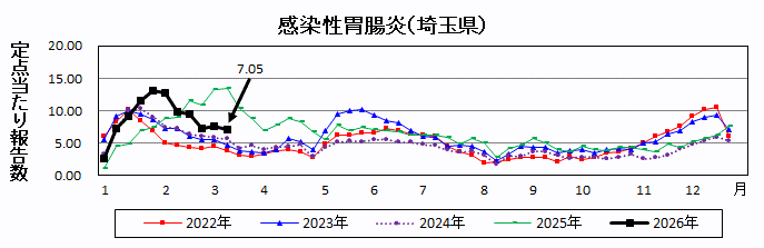 埼玉県発表の統計によると、令和8年3月9日~3月15日の定点からの報告では、感染性胃腸炎の患者は783人(定点当たり7.05人)であり、前週と比較して同水準でしたが、依然としてやや多い状況にあります。