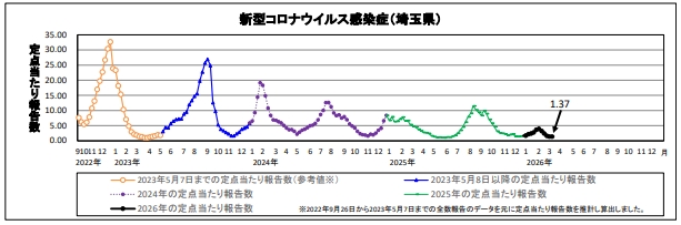 埼玉県発表の統計によると、令和8年3月9日~3月15日の定点からの報告では、新型コロナウイルス感染症患者は241人、定点当たり1.37人と先週と比較して同水準でした。基幹定点医療機関からの入院患者の報告は11人でした。