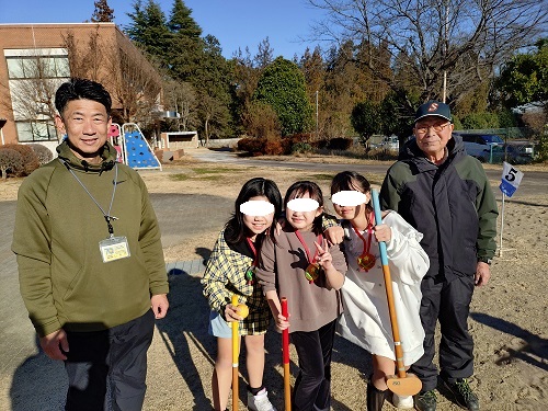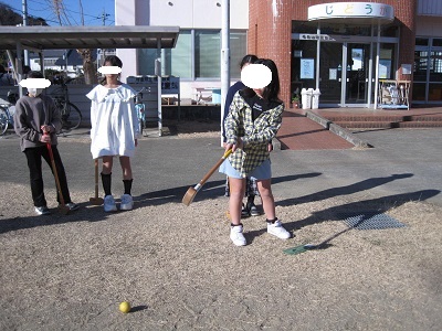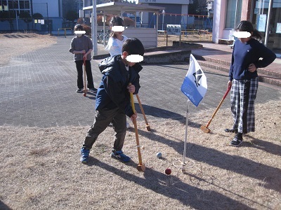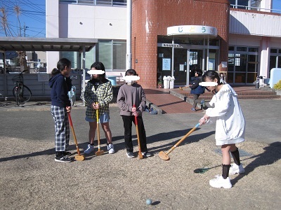 参加した児童は2年生男子と4年生女子4人の5人。運動場全体を使って5ホールを設置しました。ぽかぽか陽気の下、個人戦でラウンドしました。