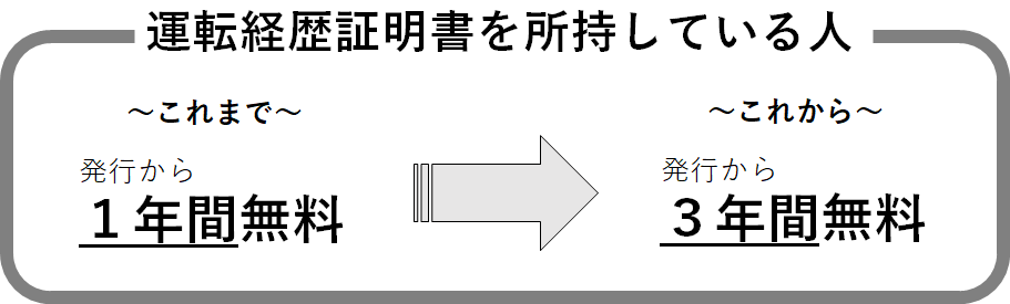 このような社会情勢等を鑑み、令和8年4月1日より、運転免許を自主返納し、運転経歴証明書を取得した方に対する無料期間を1年間から3年間に延長することとなりました。