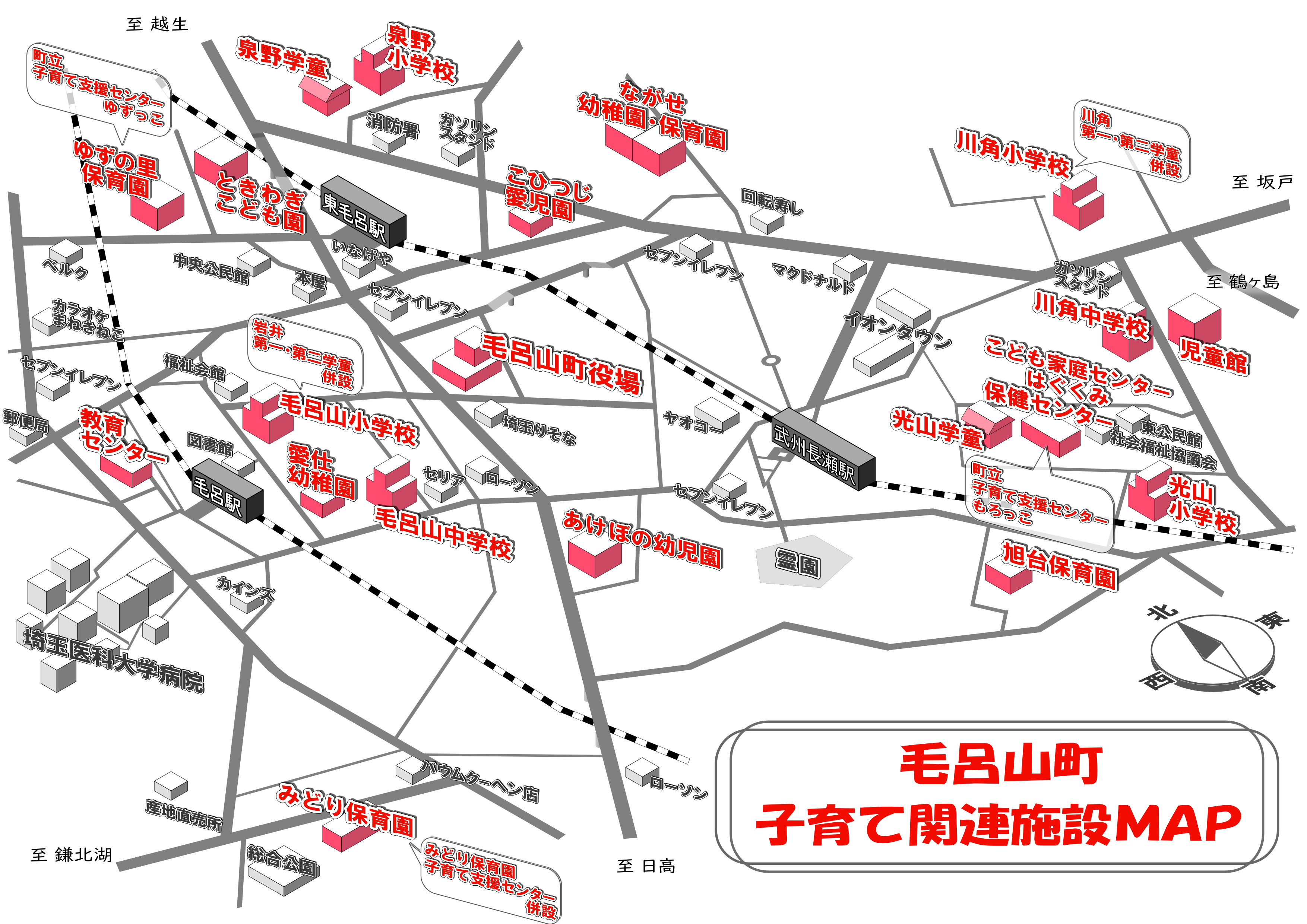 毛呂山町にある幼稚園、保育園、認定こども園、子育て支援センター、子育て支援室、児童館などの子育て支援施設の地図になります。ぜひご覧下さい。